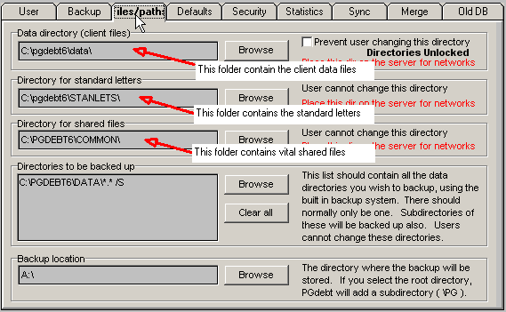 Then go to the Options/supervisor/file-paths screen. This screen will be similar to the one shown below and contains the locations of your client data files, standard letters and shared files.Observe the folders listed on this screen and make a note of them on a piece of paper, then close PGdebt.